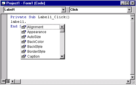 Рис. 3.17. Visual Basic при вводе процедуры в окне редактора кода открывает список свойств и методов объекта 9. Для задания процедуры, выполняемой при установке курсора на текстовом объекте и двойном нажатии кнопки мыши, необходимо запомнить значение, которое имела метка при загрузке формы на выполнение. Для этого из списка Object выберите значение Form, а из списка Procedure — событие Load, возникающее при загрузке формы, и создайте следующую процедуру: Private Sub Form Load() Labell.Tag = Labell.Caption End Sub 10. В окне редактора кода из списка. Procedure выберите значение DblClick и сформируйте следующую процедуру. Private Sub Labell_DblClick() Labell.Caption = Labell.Tag End Sub На рис. 3.18 показано окно редактора кода со всеми сформированными процедурами. 11. После ввода текста процедуры закройте окно редактора кода, выбрав команду Close системного меню окна или нажав кнопку Закрыть, расположенную в верхнем правом углу заголовка окна.