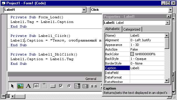 назад | содержание | вперед Элементы управления формы Наиболее часто используемыми элементами управления формы являются текстовая информация, текстовые поля и кнопки управления. Рассмотрим их назначение. Размещение в форме текста (заголовков, надписей к полям, поясняющей информации) осуществляется с помощью кнопки Label (Метка), находящейся на панели элементов управления формы. Для размещения в форме текстовой информации нажмите кнопку Label на панели инструментов. Если данная панель отсутствует на экране, для ее отображения выберите в меню View команду Toolbox или нажмите кнопку Toolbox на стандартной панели инструментов. Затем установите указатель мыши на место предполагаемого расположения текстового объекта и нарисуйте рамку требуемого размера. В форме появляется объект, в названии которого содержится слово Label. Откройте окно свойств созданного объекта properties. Для этого выделите его и выбегите в контекстном меню команду Properties (Свойства). Посмотрите свойства, которыми объект данного типа характеризуется. Текст метки задается свойством caption. Выделите данное свойство, после чего в правый столбец свойства введите нужную текстовую информацию. Текст, задаваемый объектом Label, не может быть изменен пользователем приложения. Но это не значит, что его нельзя изменить при выполнении приложения. Изменить текст можно программно. Рассмотрим небольшой пример. Создадим приложение, в котором форма содержит текстовую надпись. Установив курсор на данной надписи и нажав кнопку мыши текст будет заменен новой надписью, а двойное нажатие кнопки мыши позволит восстановить исходное значение. 1. Для создания нового приложения в меню File (Файл) выберите команду New Project (Новый проект). Откроется окно Project с расположенной в нем новой формой. 2. Чтобы разместить в форме текстовую информацию, нажмите кнопку Label на панели элементов управления. Затем установите курсор в верхнюю часть формы и нарисуйте рамку требуемого размера. 3. Откройте окно свойств. Для этого установите курсор на созданном объекте и щелкните правой кнопкой мыши, а затем выберите из контекстного меню команду Properties. 4. Выделите свойство Caption (Надпись) и введите в правом столбце текст заголовка, например, Текст, отображаемый при загрузке формы. 5. Для свойства AutoSize надписи установите значение True. В этом случае размер надписи будет зависеть от отображаемого в ней текста таким образом, чтобы он весь поместился в одну строку. Более подробно о свойстве AutoSize описано в главе 8. 6. Так как требуется, чтобы при выборе текстового объекта с помощью мыши он замещался другой текстовой информацией, необходимо создать процедуру обработки данного события. Для открытия окна редактора кода дважды щелкните на объекте Label. 7. В окне редактора кода из списка Object выбрано значение Label 1, указывающее имя текстового объекта, а из правого списка Procedure значение Click, позволяющее задать процедуру обработки события нажатия кнопки мыши. 8. В области создания процедуры между операторами private Sub Labell_click() и End Sub расположите следующую команду: Labell.Caption = "Текст, отображаемый в форме при нажатии кнопки мыши" При вводе команд в окне редактора кода, после того как введено имя объекта и поставлена точка, открывается список свойств и методов объекта (рис. 3.17), который можно использовать для ввода информации. Выберите из списка свойство caption, дважды 