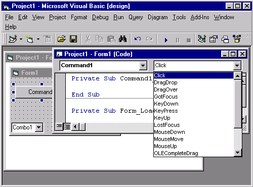 назад | содержание | вперед События и методы Visual Basic является объектно-ориентированным языком программирования. Помимо свойств, объект имеет методы, определяющие выполняемые им действия, например перемещение, изменение размеров. Используя предусмотренные для объектов методы, можно обойтись минимальным программированием приложения. Например, для печати образа формы достаточно вставить оператор следующего вида: Form1.PrintForm где Form1 — форма, а PrintForm — название метода. Среди методов, которыми обладают все объекты, можно назвать Move, позволяющий перемещать объект; setFocus, активизирующий объект, чтобы иметь возможность с ним взаимодействовать. Помимо свойств и методов, для объектов можно задать программные коды, написанные на языке Visual Basic и выполняемые при наступлении связанных с ними событий. Например, при нажатии кнопки происходит событие click (Нажатие кнопки мыши). Для обработки данного события при создании формы должна быть написана требуемая процедура. Чтобы открыть окно, предназначенное для ввода программного кода, выполните одно из следующих действий: