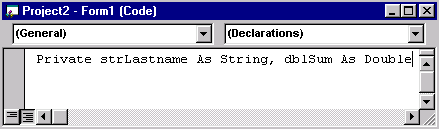 Для создания переменной, которую вы хотите определить в качестве глобальной, в раздел General Declarations главного модуля приложения поместите оператор public. Например: Public gdtmFinish As Date Для объявления переменной, локальной внутри модуля или формы, используйте оператор private или Dim в разделе General Declarations модуля или формы (рис. 5.2). В этом случае объявленная переменная будет доступна для всех входящих в форму или модуль процедур, но в то же время недоступной в процедурах других модулей и форм.