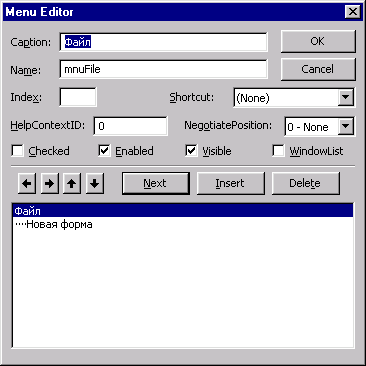 Рис. 7.8. Окно редактора меню Menu Editor Элементы группы конструирования структуры меню позволяют добавлять и удалять новые пункты меню, перемещать пункты по вертикали, меняя порядок их следования, и по горизонтали, меняя расположение пунктов в иерархии системы меню: