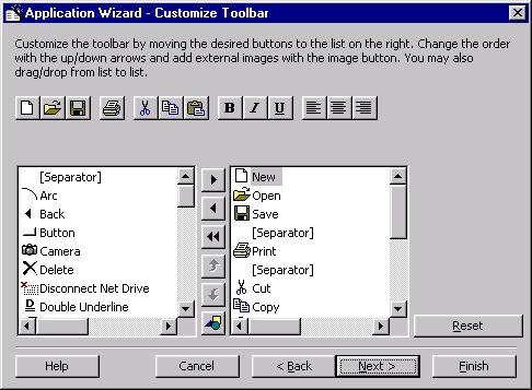 назад | содержание | вперед Мастер панелей инструментов Toolbar Wizard Для проектирования панелей инструментов в программе Visual Basic можно использовать мастер панелей инструментов, работающий в составе мастера приложений VB Application Wizard.