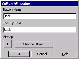 Рис. 7.11. Окно мастера проектирования панелей инструментов При выполнении любого из этих действий требуемая кнопка перемещается в правый список и одновременно добавляется на панель инструментов. Чтобы отредактировать наименование или изменить значок кнопки, располагаемой на панели инструментов в верхней части окна мастера, нажмите данную кнопку. Откроется диалоговое окно Button Attributes (Атрибуты кнопки) (рис. 7.12), в котором можно изменить требуемые параметры. Для изменения значка нажмите кнопку Change Bitmap и с помощью открывшегося диалогового окна выберите графический файл для изображения, размещаемого на кнопке.