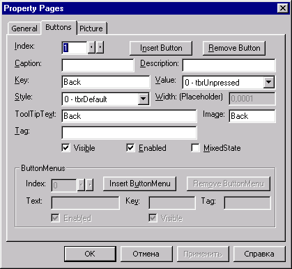 Возможности настройки панели инструментов рассмотрим на примере. Для этого сконструируем небольшую панель инструментов в приложении MyMDIApp, созданном для проверки свойств интерфейса в стиле MD1. Выполните для этого следующие действия: 1. Подключите к проекту библиотеку Microsoft Windows Common Controls 6.0, в которой содержится элемент управления ToolBar, воспользовавшись диалоговым окном Components (Компоненты). 2. Добавьте в родительскую форму объект ToolBar, дважды щелкнув мышью кнопку ToolBar на панели элементов управления. 3. Откройте окно свойств, выбрав команду Properties Window (Окно свойств) в меню View (Вид) при выделенной в форме панели инструментов. 4. Используя свойство Name, присвойте панели имя tbrTools. 5. Панель инструментов создана, теперь необходимо разместить на ней кнопки. Для этого вызовем окно проектирования панели, нажав на ней правую кнопку мыши и выбрав в появившемся контекстном меню команду Properties (Свойства). 6. В открывшемся диалоговом окне Property Pages (рис. 7.13) по умолчанию выбрана вкладка General (Основная), позволяющая установить основные свойства панели. Оставим параметры в исходном состоянии. Выберите вкладку Buttons (Кнопки), с помощью которой создаются кнопки панели инструментов. 7. Нажмите кнопку Insert Button (Вставить кнопку) для добавления новой кнопки на панель инструментов. Эту кнопку будем использовать для вызова нового дочернего окна формы, то есть как аналог команды Новая форма меню Файл родительского окна.