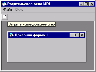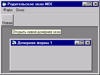 9. Запрограммируем действие, выполняемое при нажатии новой кнопки. Для вызова редактора кода дважды щелкните мышью на панели tbrTools. При этом будет автоматически использован шаблон для действия, выполняемого при нажатии на кнопку панели инструментов. Введите следующий программный код: Private Sub tbrTools_ButtonClick (ByVal Button As MSComctlLib. Button) Select Case Button.Key Case Is = "ToolsNewForm" Dim frmNewForm As New frmChildMDI frmCount = frmCount + 1 frmNewForm.Caption = "Дочерняя форма " + Str(frmCount) frmNewForm.Show End Select End Sub