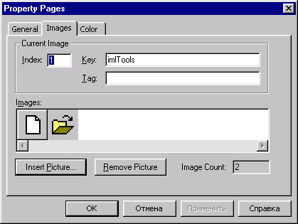 Рис. 7.15. Диалоговое окно Property Pages объекта ImageList 5. Для идентификации списка изображений введите в поле Key (Ключ) имя списка imITools. 6. Чтобы добавить в список графическое изображение, нажмите кнопку Insert Picture (Вставить изображение). Откроется диалоговое окно поиска графических файлов. Выберите требуемый файл и нажмите кнопку Открыть. Графическое изображение добавляется в список. Для добавления следующего элемента списка опять нажмите кнопку Insert Picture. Завершив формирование всего списка графических изображений, нажмите кнопку ОК для закрытия диалогового окна Property Pages.