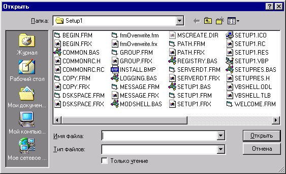 Рис. 7.22. Диалоговое окно открытия файла, созданное с помощью объекта CornmonDialog Для ввода кода достаточно дважды щелкнуть на объекте cbcontroi левой кнопкой мыши. При этом открывается редактор кода с шаблоном кода для события click этой кнопки. Значения для свойства cdlMyDialog. Flags указаны в табл. 7.12. Таблица 7.12. Значения для метода Flags диалогового окна открытия файла