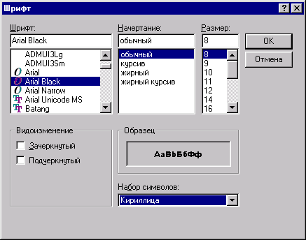 назад | содержание | вперед Диалоговое окно настройки шрифтов текста Для вызова диалогового окна настройки шрифтов (рис. 7.26) необходимо в событие click кнопки cbcontrol ввести следующий код: Private Sub cbControl_Click() cdlMyDialog.Flags = cdlCFBoth + cdlCFEffects cdlMyDialog.ShowFont End Sub