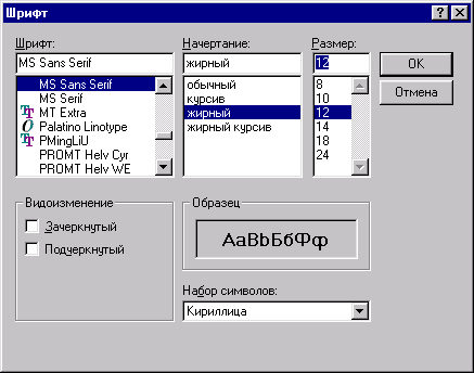 назад | содержание | вперед Метка Как уже было сказано в главе 3, для размещения в форме текстовой информации, которая не может быть изменена пользователем приложения, используется элемент управления Label (Метка). Рассмотрим более подробно его свойства. Откройте окно свойств Properties данного объекта. Для этого выделите его и выберите в контекстном меню команду Properties (Свойства). Текст метки задается свойством caption. Он может быть установлен в окне Properties или программно. Шрифт текстовой информации определяется свойством Font (Шрифт). Для выбора шрифта в окне свойств установите курсор в данное свойство и нажмите кнопку с тремя точками в правом столбце свойства. Открывается диалоговое окно Выбор шрифта (рис. 8.1), содержащее три списка, позволяющих указать наименование, начертание и размер шрифта. Используя свойства ForeColor и Backcolor, можно задать цвет текстовой информации и цвет фона элемента управления. Свойство BorderStyle (Стиль рамки) определяет тип обрамления вокруг объекта Label, позволяя оформить надпись в виде текстового поля. Для этого вместо используемого по умолчанию значения None необходимо выбрать для свойства значение Fixed Single. Свойство Appearance позволяет придать тексту некоторую объемность. Свойство Alignment (Выравнивание) определяет выравнивание текста в элементе управления по правому, левому краю или по ширине. Если информация в объекте размещена на нескольких строках, то выравнивание осуществляется на каждой строке.