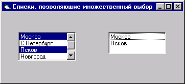Для обработки множественного выбора нельзя использовать свойство Listindex, применяемое при работе с обычными списками. Выбор нескольких элементов списка фиксируется в свойстве Selected, являющимся массивом, размерность которого равна количеству элементов в списке (определяется свойством ListCount). Выбранному элементу списка соответствует значение True соответствующего элемента свойства selected, а остальным — False. Рассмотрим пример использования свойства Selected. Разместим в форме два списка. В первый список введем элементы с использованием свойства List. Список элементов во втором списке будет формироваться при перемещении на него фокуса после выбора элементов первого списка. Таким образом, второй список будет содержать выбранные в первом списке элементы. Для создания приложения выполните следующие действия: 1. Разместите в форме два списка с помощью кнопки ListBox на панели элементов управления. 2. Используя свойство List первого списка, введите элементы списка. 3. Чтобы разрешить выбор из первого списка нескольких элементов, установите для свойства Multiselect значение 1-Simple. 4. Теперь необходимо задать процедуру формирования элементов второго списка при перемещении на него фокуса. Для этого дважды щелкните мышью на втором списке. 5. В открывшемся окне редактора кода из списка Procedure выберите событие GotFocus (Получение фокуса) и введите следующий код: Private Sub List2_GotFocus() List2.Clear For i = 0 To List1.ListCount — 1 If List1.Selected(i) Then List2.Addltem (List1.List (i)) Next End Sub На рис. 8.14 представлен полученный результат.