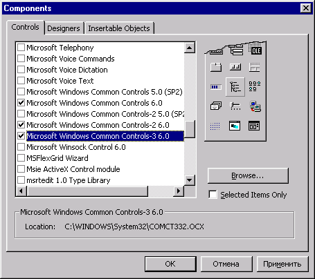 Рис. 8.27. Диалоговое окно Components 2. На вкладке Controls (Элементы управления) расположен список групп элементов управления. Требуемые нам стандартные элементы управления Microsoft размещены в следующих группах: