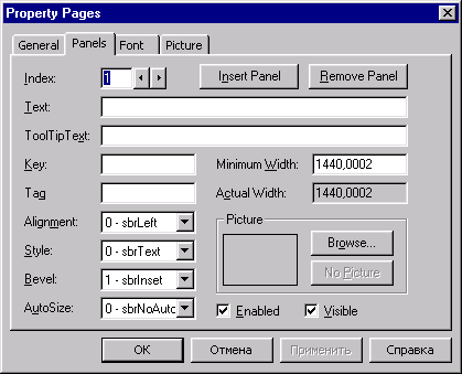 Рис. 8.36. Вкладка Panels диалогового окна Property Pages В верхней части вкладки Panels (Панели) диалогового окна Property Pages расположено поле index, указывающее номер панели, для которой в данный момент отображаются свойства. Кнопки Insert Panel (Добавить панель) и Remove Panel (Удалить панель) позволяют добавлять или удалять панель из строки состояния.