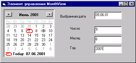 назад | содержание | вперед Работа с календарем Чтобы определить выбранную в элементе управления Monthview дату, необходимо воспользоваться свойством Value. Помимо этого, данный элемент управления характеризуется дополнительными свойствами, позволяющими определить число, месяц и год выбранной из календаря даты, а также номер недели: