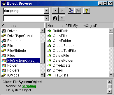 Рис. 9.9. Класс FileSystemObject в системе FSO Список методов этого класса гораздо богаче. В него входят методы, описанные в табл. 9.1). Таблица 9.11. Список методов класса FileSystemObject