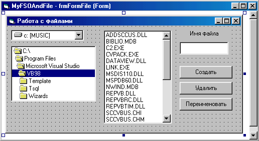 назад | содержание | вперед Работа на уровне файлов Для создания файла можно использовать метод createTextFile класса FileSystemObject: Dim NewFSO As New FileSystemObject, NewFile As TextStream Set NewFile = NewFSO.CreateTextFile ("C:\NewFile.txt") Для удаления файла используется метод Delete класса File. Необходимо заметить, что перед удалением файл должен быть закрыт с помощью метода close. Программный код, выполняющий удаление файла в приложении, выглядит следующим образом: Dim NewFile As TextStream, File Set NewFile = NewFSO.CreateTextFile("c:\NewFile.txt") NewFile.Close Set File = NewFSO.GetFile("c:\NewFile.txt") File.Delete В этом примере файл сначала создается, а затем удаляется. Перемещение файлов выполняется с помощью метода Move класса File. Если воспользоваться предыдущим текстом, то код, выполняющий перемещение файла, выглядит следующим образом: Dim NewFile As TextStream, File Set NewFile = NewFSO.CreateTextFile("c:\NewFile.txt") NewFile.Close Set File = NewFSO.GetFile("c:\NewFile.txt") File.Move ("c:\NewFile.txt") При этом, как и при удалении, необходимо закрывать файл. Копирование файла выполняется аналогично перемещению с использованием метода copy. Разработаем приложение для изучения работы с файлами. Для этого воспользуемся приложением, созданным в предыдущем примере при рассмотрении работы с папками. Откройте приложение и модифицируйте его следующим образом: 1. Увеличьте размер формы, переставьте кнопки и текстовое поле с меткой, как показано на рис. 9.13. Текст метки измените на Имя файла. 2. Добавьте в форму объект типа FileListBox (Список файлов), дважды щелкнув мышью кнопку FileListBox на панели элементов управления. Используя свойство Name, назовите его filFiles. 3. Измените текст кода в приложении на указанный ниже: Dim NewFSO As New FileSystemObject, Folder As Folder Dim sNameFolder As String Dim sNameFile As String Dim File Private Sub cbCreate_Click() ' Создание файла Dim NewFile As TextStream sNameFile = dirFolders.Path + "\" + txtNameFile.Text Set NewFile = NewFSO.CreateTextFile(sNameFile) filFiles.Refresh End Sub Private Sub cbDelete_Click() ' Удаление файла sNameFolder = dirFolders.Path Set Folder = NewFSO.GetFolder(sNameFolder) If Folder.IsRootFolder = True Then sNameFile = filFiles.Path + filFiles.FileName Else sNameFile = filFiles.Path + "\" + filFiles.FileName End If Set File = NewFSO.GetFile(sNameFile) File.Delete filFiles.Refresh End Sub Private Sub cbRename_Click () ' Переименование файла sNameFolder = dirFolders.Path Set Folder = NewFSO.GetFolder(sNameFolder) If Folder.IsRootFolder = True Then sNameFile = filFiles.Path + filFiles.FileName Else sNameFile = filFiles.Path + "\" + filFiles.FileName End If Set File = NewFSO.GetFile(sNameFile) File.Name = txtNameFile.Text fil Files.Refresh End Sub Private Sub dirFolders Change() filFiles.Path = dirFolders.Path End Sub Private Sub drvSelectDrive_Change() dirFolders.Path = drvSelectDrive.Drive End Sub Private Sub filFiles_Click() txtNameFile.Text = filFiles.FileName End Sub