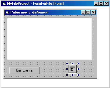 8. Присвойте созданному объекту типа CommonDialog имя cdCommonDialog. 9. Для фильтрации файлов в свойство Filter объекта cdCommonDialog введите следующий текст: Все файлы (*. *) |*. * | Текстовые файлы (*. txt) \ *. txt \. 10. Добавьте В форму FormForFile кнопку управления типа CommandButton, дважды щелкнув мышью кнопку CommandButton на панели элементов управления. 11. После появления объекта в форме назовите эту кнопку cbstart и присвойте свойству Caption значение Выполнить. Созданная в форме кнопка cbstart будет служить для выполнения действий по событию кнопки Click. Созданное тестовое приложение показано на рис. 9.2. Полученное приложение можно теперь использовать для изучения работы с файлами. Запрограммируем приложение на чтение данных из файла последовательного доступа. Для этого откроем окно редактора кода и введем следующий код: Dim strFileName As String Dim strFileContent As String Dim nFreeFile As Integer Dim nFileLenght As Integer Private Sub cbStart_Click() cdCommonDialog.ShowOpen strFileName = cdCommonDialog.FileName nFreeFile = FreeFile If strFileName <> "" Then Open strFileName For Input As nFreeFile nFileLenght = FileLen(strFileName) strFileContent = Input(nFileLenght, #nFreeFile) txtFile.Text = strFileContent Close End If End Sub