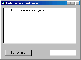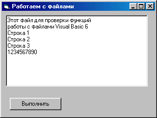 Рис. 9.2. Вид приложения для изучения функций работы с файлами Работающее приложение показано на рис. 9.3. В данном случае при нажатии кнопки Выполнить открывается диалоговое окно поиска файла. Путь и имя файла, возвращаемое диалоговым окном, хранятся в переменной strFileName. Найденный файл (он должен быть текстовым) открывается при помощи оператора open для чтения данных. Функция input считывает сразу весь файл в переменную strFileContent, содержимое которой затем помещается в текстовое поле txtFile. После выполнения всех действий файл закрывается оператором close. Чтобы прочитать данные при помощи оператора Line Input #, необходимо заменить текст кода, расположенный сразу после оператора open, на следующий: Do While Not EOF(nFreeFile) Line Input #nFreeFile, strFileContent txtFile.Text = txtFile.Text + strFileContent +Chr$(13) + Chr$(10) Loop Close В этом цикле данные из файла построчно считываются в переменную strFileContent и помещаются в текстовое поле txtFile. Цикл работает до достижения конца файла, который контролируется функцией EOF. Применение цикла не требует знания длины файла, что иногда предпочтительнее.