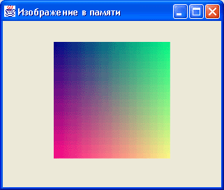 С каждым экземпляром класса image связан объект, реализующий интерфейс ImageProducer. Его можно получить методом getSource () класса Image. Самая простая реализация интерфейса ImageProducer — класс метогу-imagesource — создает пикселы в оперативной памяти по массиву байтов или целых чисел. Вначале создается массив pix, содержащий цвет каждой точки. Затем одним из шести конструкторов создается объект класса MemoryimageSource. Он может быть обработан потребителем или прямо преобразован в тип Image методом createlmage (). В листинге 15.1 приведена простая программа, выводящая на экран квадрат размером 100x100 пикселов. Левый верхний угол квадрата синий, левый нижний — красный, правый верхний — зеленый, а к центру квадрата цвета перемешиваются. Листинг 15.1. Изображение, построенное по точкам import java.awt.*; import j ava.awt.event.*; import java.awt.image.*; class InMemory extends Frame { private int w = 100, h = 100; private int[] pix = new int[w * h]; private Image img; InMemory(String s)( super(s); int i = 0; for (int у = 0; у < h; y++){ int red = 255 * у / (h - 1); for (int x = 0; x < w; x++){ int green = 255 * x / (w — 1) ; pix[i++] = (255 << 24)|(red << 16)|(green << 8)| 128; } } setSize(250, 200); setVisible(true); } public vqid paint(Graphics gr){ if (img == null) img = createlmage(new MemoryImageSource<w, h, pix> 0, w)); gr.drawlmage(img, 50, 50, this); } public static void main(String[] args){ Frame f= new InMemory(" Изображение в памяти"); f.addWindowListener(new WindowAdapter(){ public void windowClosing(WindowEvent ev){ System.exit (0); } }); } } В листинге 15.1 в конструктор класса-поставщика MemoryimageSource (w, h, pix, о, w) заносится ширина w и высота h изображения, массив pix, смещение в этом массиве о и длина строки w. Потребителем служит изображение img, которое создается методом createlmage () и выводится на экран методом drawlmage(img, 50, 50, this). Левый верхний угол изображения img располагается в точке (50, 50) контейнера, а последний аргумент this показывает, что роль imageObserver играет сам класс InMemory. Это заставляет включить в метод paint о проверку if (img == null), иначе изображение будет постоянно перерисовываться. Другой способ избежать этого — переопределить метод imageupdate (), о чем говорилось в главе 14, просто написав В нем return true. Рис. 15.1 демонстрирует вывод, этой программы.