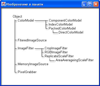 Рис. 15.2 . Классы, реализующие модель "поставщик-потребитель" К этим методам обращается поставщик для передачи пикселов потребителю. Передается прямоугольник шириной width и высотой height с заданным верхним левым углом (х, у), заполняемый пикселами из массива pix, начиная с индекса offset. Каждая строка занимает scansize элементов массива pix. Цвета пикселов определяются в цветовой модели model (обычно это модель RGB). На рис. 15.2 показана иерархия классов, реализующих модель "поставщик-потребитель".