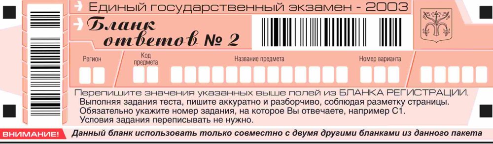 Бланк ответов № 2 предназначен для записи развернутых ответов на задания в свободной форме. В верхней части бланка расположены совпадающие вертикальный и горизонтальный варианты штрих-коды, поле, для которого не указано название (для служебных целей, не заполняемое участником ЕГЭ) и поля для рукописного занесения информации: код региона; код предмета; название предмета; номер варианта теста. Ниже представлено изображение верхней (регистрационной) части бланка №2.