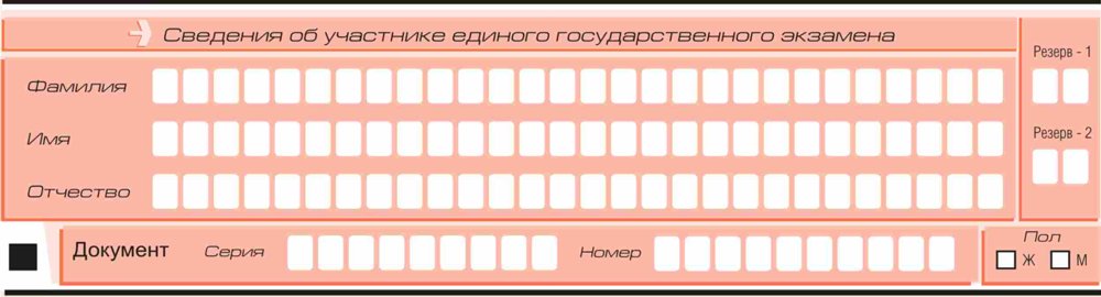 Бланк регистрации состоит из трех основных частей. В верхней части бланка расположены: - вертикальный и горизонтальный штрих-коды, - строка с образцами написания символов, - поле для подписи экзаменуемого, - поля для рукописного занесения информации: