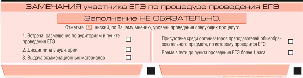 В нижней части бланка регистрации расположена область замечаний выпускника по процедуре проведения ЕГЭ. Заполнение соответствующих полей необязательно и производится по желанию выпускника. В области замечаний выпускник может отметить имевшиеся, по его мнению, нарушения процедуры ЕГЭ в день его проведения. Бланк ответов № 1