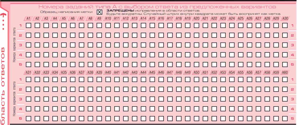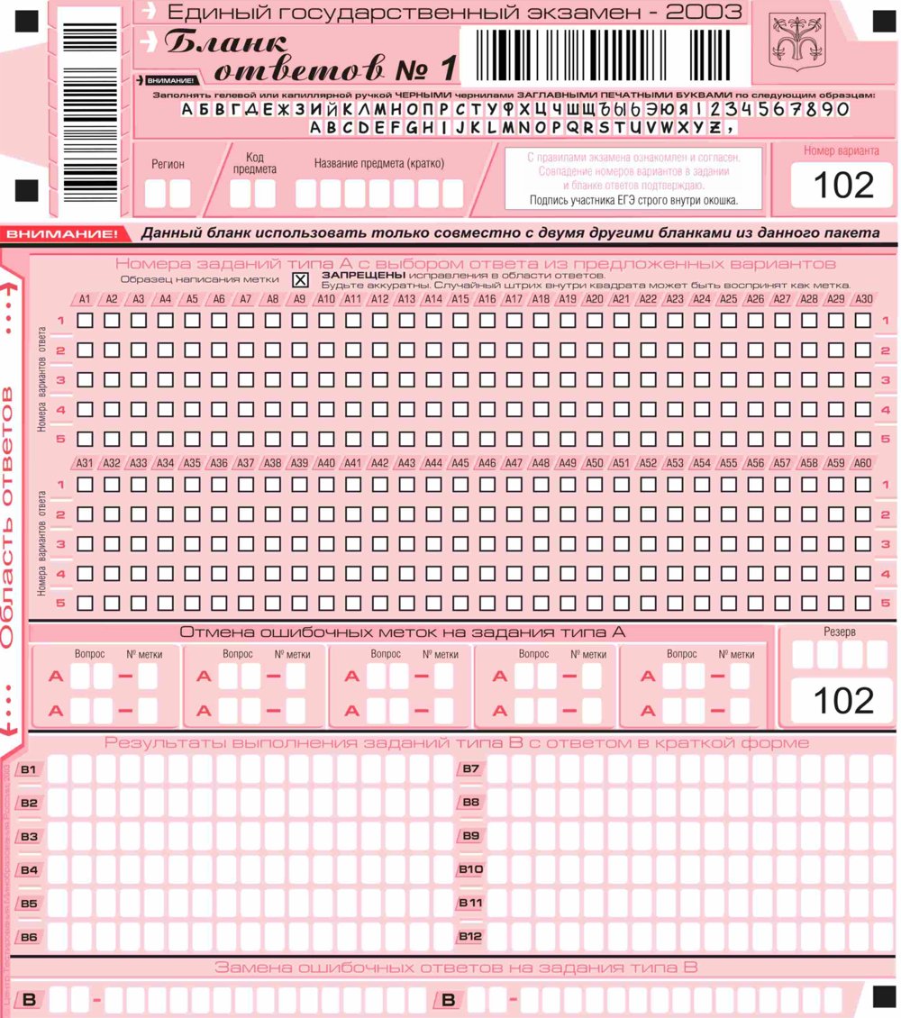 В верхней части бланка № 1 расположены вертикальный и горизонтальный штрих-коды, строка с образцами написания символов, номер варианта теста, а также поля для рукописного занесения информации выпускником: код региона, код предмета, краткое название предмета, поле для подписи выпускника. Информация для заполнения полей этой части бланка должна быть продублирована с информацией, внесенной в бланк регистрации. Область для ответов на задания части А В средней части бланка № 1 расположены поля для записи ответов на задания с выбором ответа (части А). Максимальное количество таких заданий – 60 (шестьдесят). Максимальное число вариантов ответов на каждое задание – 5 (пять).