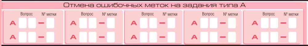 Область ответов на задания части А состоит из горизонтального ряда номеров заданий теста. Под каждым номером задания расположен вертикальный столбик из пяти клеточек. Для того чтобы отметить ответ, который выпускник считает правильным, под номером задания он должен поставить метку («крестик») в ту клеточку, номер которой соответствует номеру выбранного им ответа. Образец записи метки приведен на бланке ответов. Для удобства работы клеточки на левом и правом полях бланка ответов № 1 пронумерованы. В области ответов на задания части А нельзя допускать случайных пометок, клякс, полос размазанных чернил и т.д., так как при автоматизированной обработке это может быть распознано как ответы на задания теста. Если не удалось избежать случайных пометок, их следует отменить в области «Отмена ошибочных меток» (см. ниже). При заполнении области ответов на задания части А следует строго соблюдать инструкции, приведенные в тесте (ко всем заданиям, группе или отдельным заданиям). Если в инструкции к тесту указано выбрать один ответ, то в столбце, соответствующем этому заданию в области ответов на задания части А, следует делать не более одной метки. При наличии нескольких меток задание заведомо будет считаться невыполненным. Можно отменить метку ошибочно выбранного ответа и поставить другую метку в нужной клеточке в этом задании. Отмена одной метки осуществляется заполнением одного поля в области «Отмена ошибочных меток на задания типа А» (см. ниже). Отменить можно не более десяти ошибочных меток по всем заданиям части А. Поэтому ставить метку нужно только после окончательного выбора правильного ответа в задании. Область отмены ошибочных меток для заданий с выбором ответов из предложенных вариантов Ниже приведены поля для отмены ошибочно записанных меток. Максимальное число отмен неверных ответов – 10 (десять).