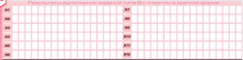 Ниже размещены поля для записи ответов в краткой свободной форме (слово или число). Максимальное количество ответов – 12 (двенадцать). Максимальное количество символов в одном ответе – 17 (семнадцать). Краткий ответ записывается справа от номера задания части В в области ответов с названием «Результаты выполнения заданий типа В с ответом в краткой форме». Краткий ответ можно давать только в форме слова или одного целого числа, если в инструкции к заданию не указано, что ответ можно дать в виде десятичной дроби. Каждая цифра, буква или знак минус (если число отрицательное) записывается в отдельное окошко, строго по образцу из верхней части бланка. Слово должно полностью состоять из печатных заглавных: