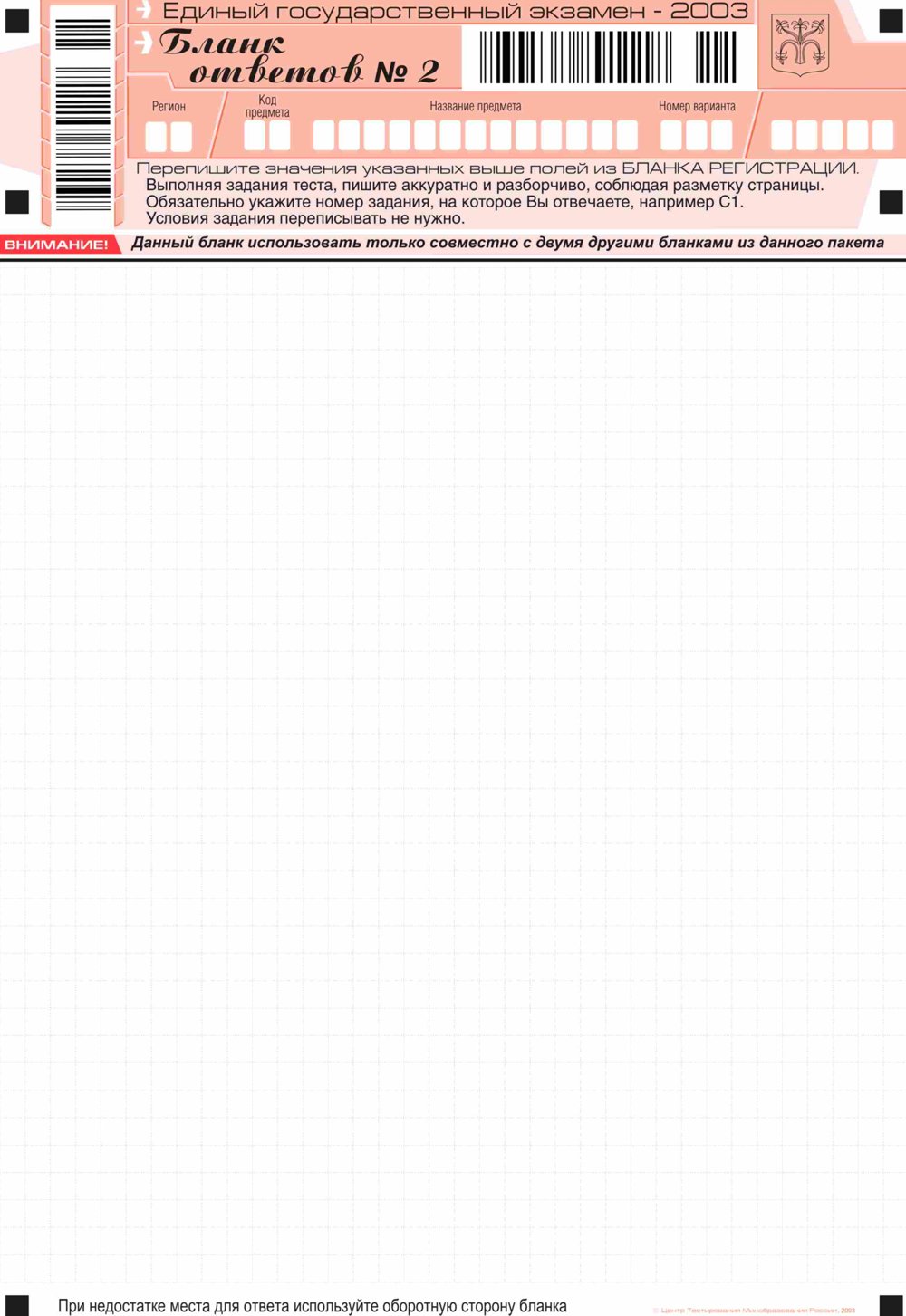 Информация для заполнения полей этой части бланка, кроме служебного поля, для которого не указано название, должна быть продублирована с информацией, внесенной в бланк регистрации и бланк ответов № 1. Ниже регистрационной части расположена область развернутых ответов на задания в свободной форме. Эта область разлинована пунктирными линиями «в клеточку» на фоне изображения сетки, принятой для ценных бумаг. В этой области выпускник записывает развернутые ответы на соответствующие задания. При недостатке места для ответов на лицевой стороне бланка ответов № 2 выпускник может продолжить записи на оборотной стороне бланка, сделав внизу лицевой стороны запись «смотри на обороте». начало раздела | начало подраздела Поделитесь этой записью или добавьте в закладки |