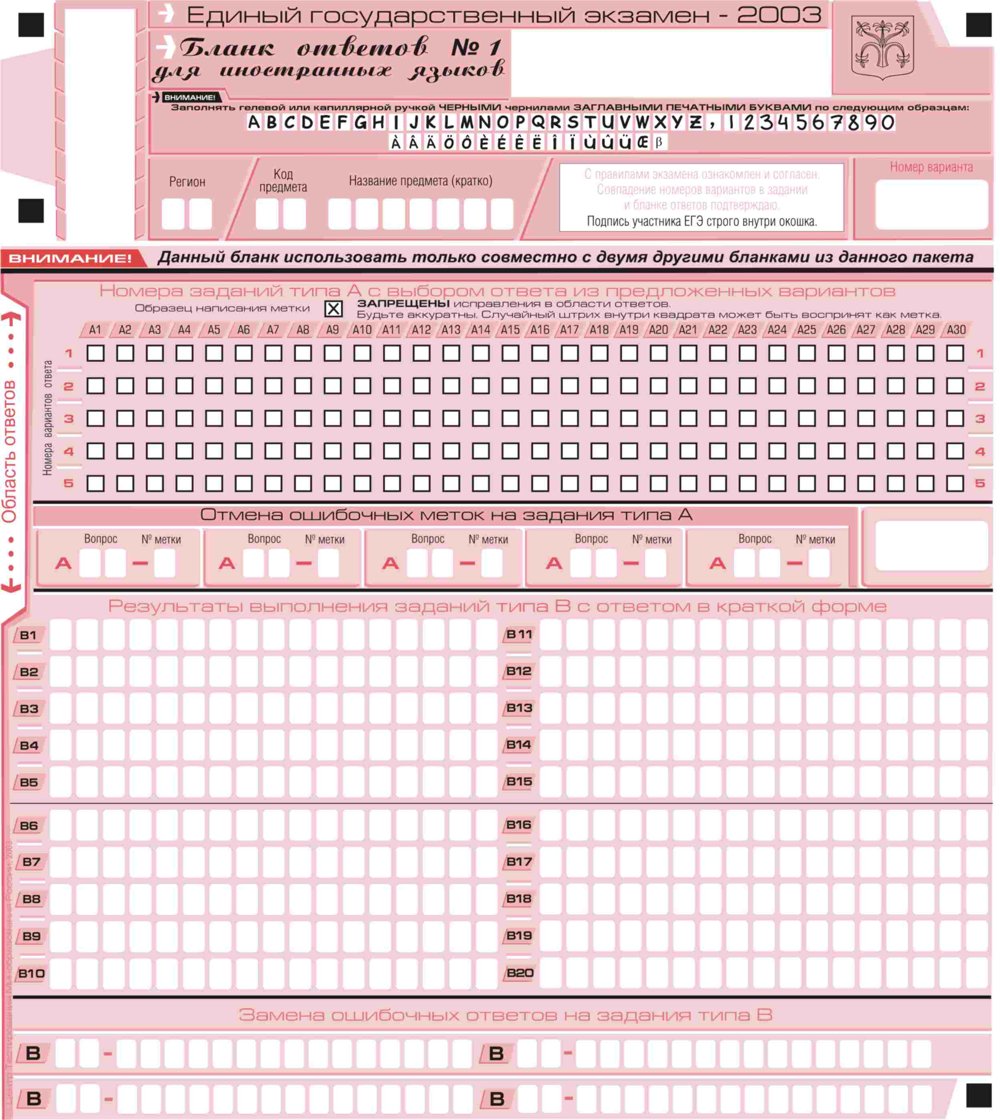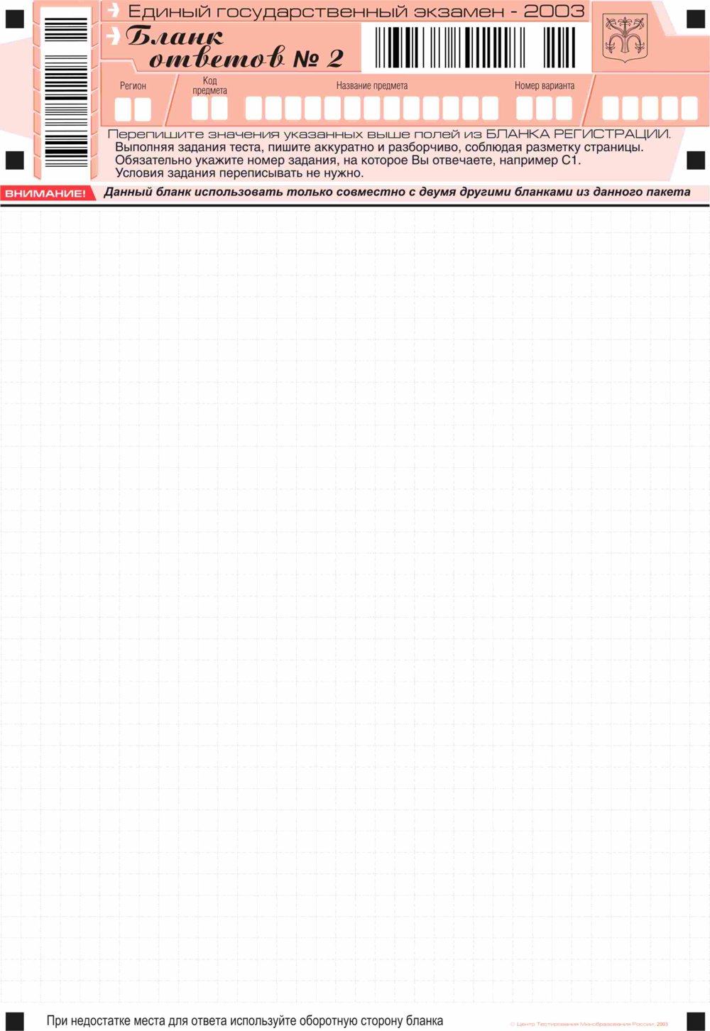 Приложение № 4 к приказу Минобразования России от 31.01.03 № 313 описание бланков единого государственного экзамена в 2003 году Бланк регистрации размером 195 • 210 мм печатается на белой бумаге плотностью ≈ 80 г/м2. Фон бланка – оранжевый цвет (пантон № 165). Бланк состоит из трех основных частей. В верхней части бланка регистрации имеются вертикальный и горизонтальный штрих-коды, образец написания символов при заполнении бланка, поля для указания следующей информации: код региона; код образовательного учреждения, в котором обучался выпускник; номер и буква класса; код пункта проведения единого государственного экзамена (ЕГЭ); номер аудитории в пункте проведения ЕГЭ; дата проведения ЕГЭ; код предмета; краткое название предмета; номер варианта; служебная отметка; поле для подписи участника ЕГЭ. В средней части бланка регистрации указываются сведения об участнике ЕГЭ: фамилия, имя, отчество; серия и номер документа; пол; поля для служебного использования. В нижней части бланка регистрации расположены поля, заполняемые по желанию участника ЕГЭ в случае имеющихся у него замечаний по процедуре проведения ЕГЭ. Бланк ответов № 1 размером 245 • 210 мм печатается на белой бумаге плотностью ≈ 80 г/м В средней части бланка ответов №1 расположены поля для записи ответов на задания типа А с выбором ответа из предложенных вариантов. Максимальное количество таких заданий – 60. Максимальное число вариантов ответов на каждое задание – 5. Ниже этого приведены поля для отмены ошибочных меток на задания типа А. Максимальное число отмен ошибочных меток – 10. Далее размещены поля для записи результатов выполнения заданий типа В с ответом в краткой форме (слово или число). Максимальное количество кратких ответов – 12. Максимальное количество символов в одном ответе – 17. В нижней части бланка ответов № 1 предусмотрены поля для замены ошибочных ответов на задания типа В. Максимальное количество замен ошибочных ответов – 2. Бланк ответов № 2 размером 210 мм • 297 мм печатается на белой бумаге плотностью ≈ 80 г/м В верхней части бланка ответов № 2 имеются вертикальный и горизонтальный штрих-коды и указываются: код региона; код предмета; название предмета; номер варианта; поле без указания названия. Поле для ответов на задания разлиновано пунктирными линиями «в клеточку». Ниже заголовка бланка по всему полю размещено изображение сетки, принятой для ценных бумаг. начало раздела | начало подраздела Поделитесь этой записью или добавьте в закладки |